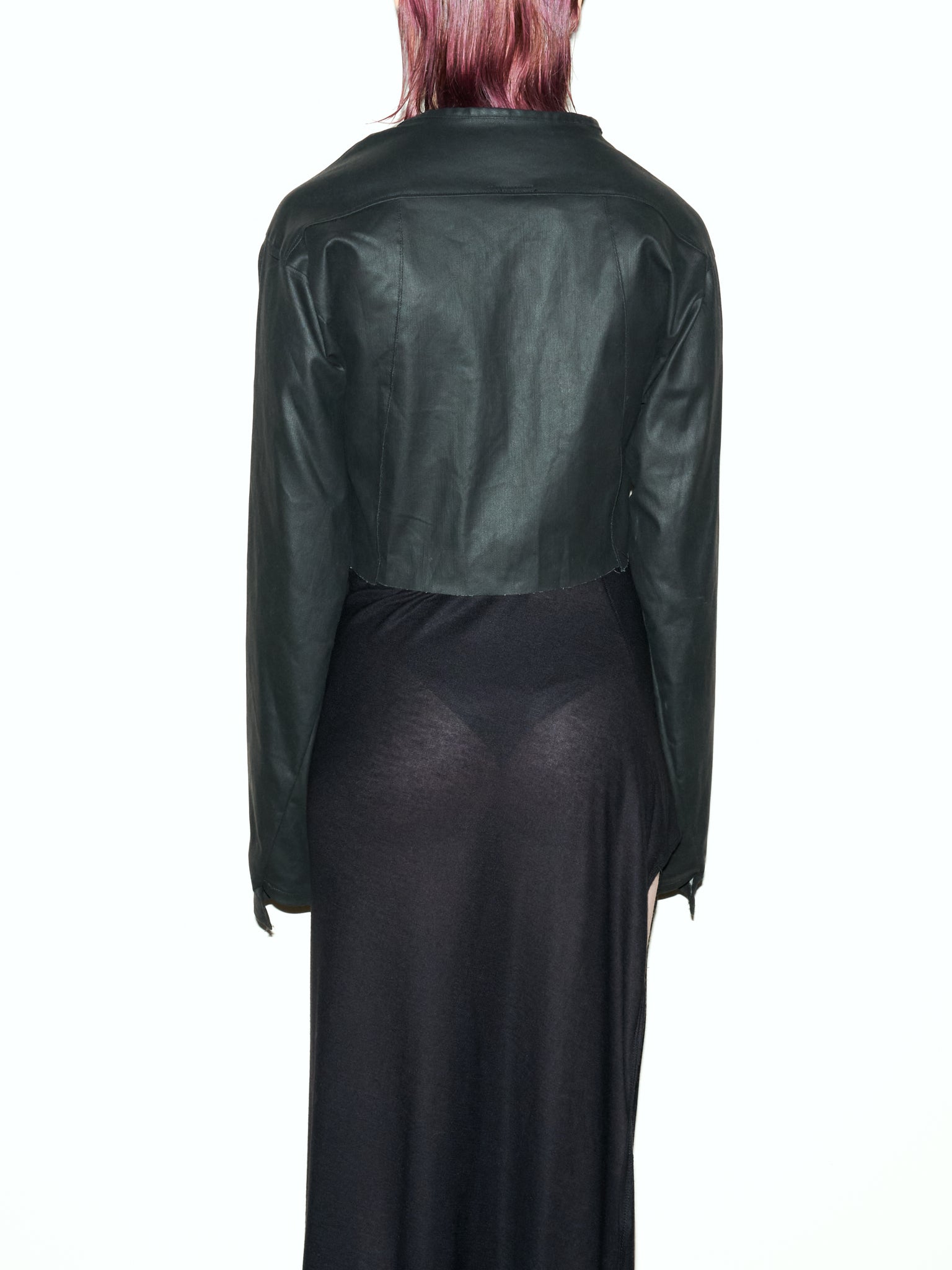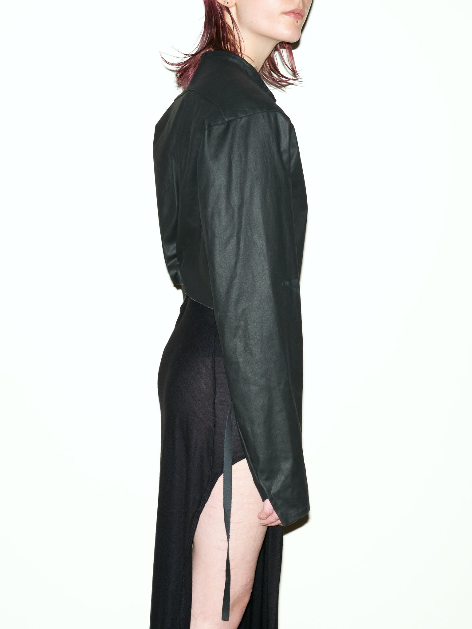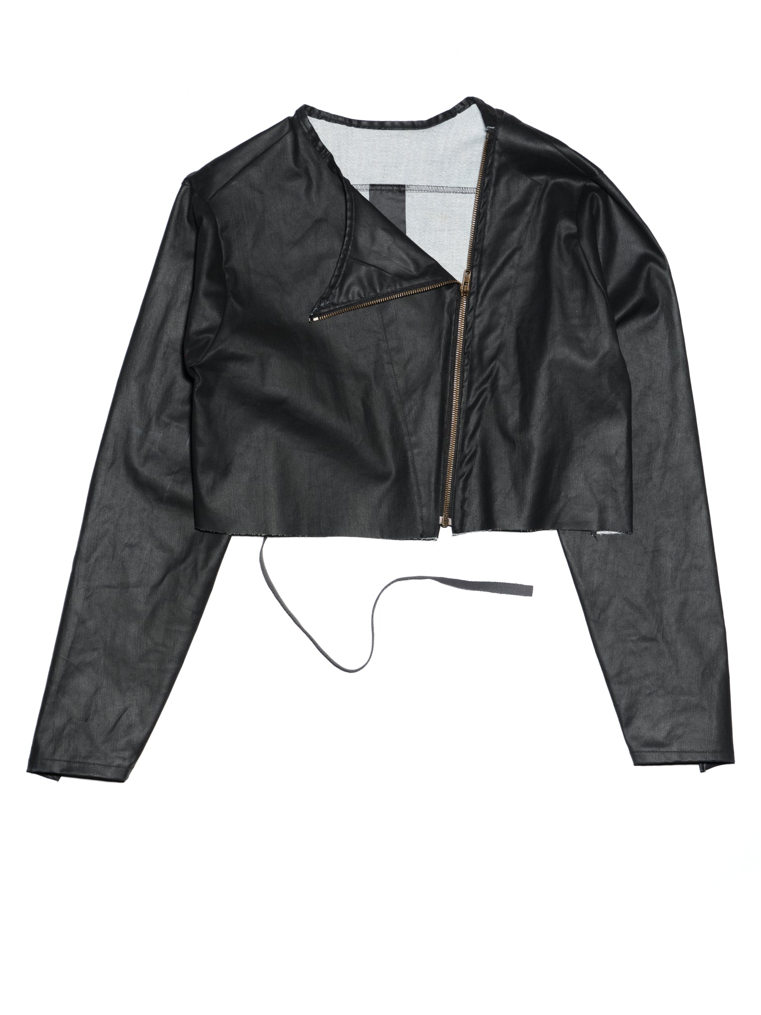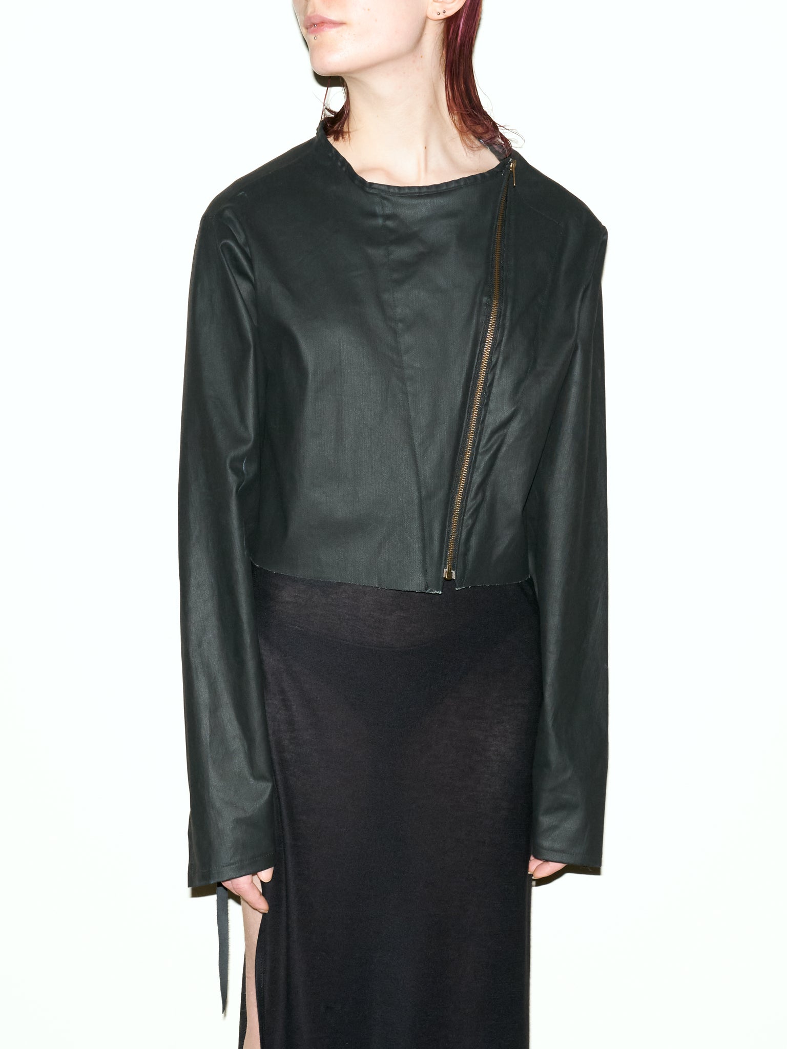 Made from polyurethane-coated cotton, this cropped jacket combines structure and modernity. Its straight cut, asymmetrical zip fastening, and leather-like finish give it a bold, contemporary look. A statement piece that adds character and style to any outfit.