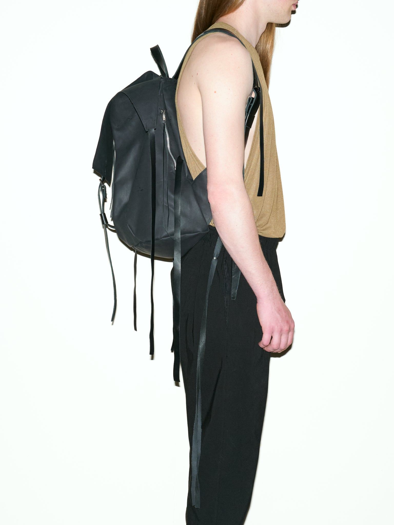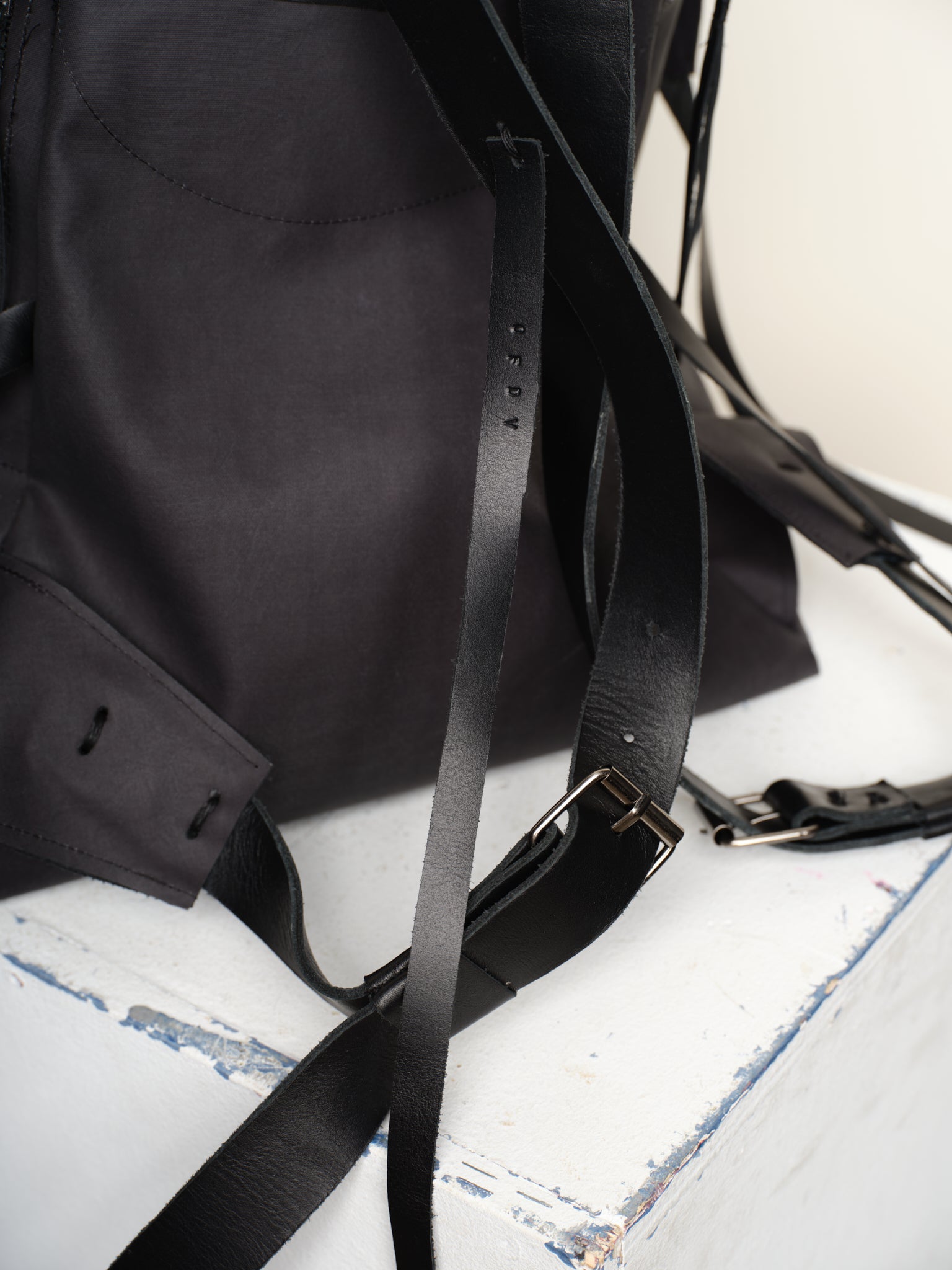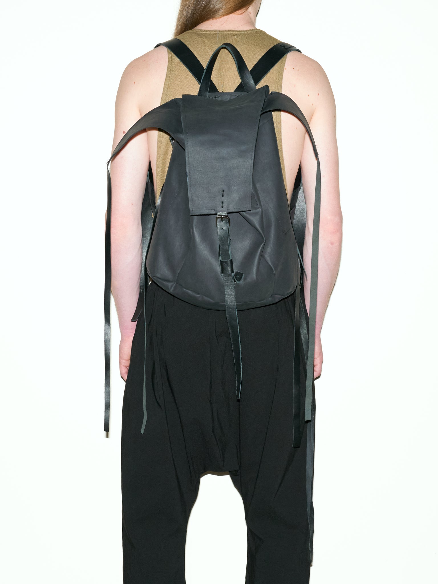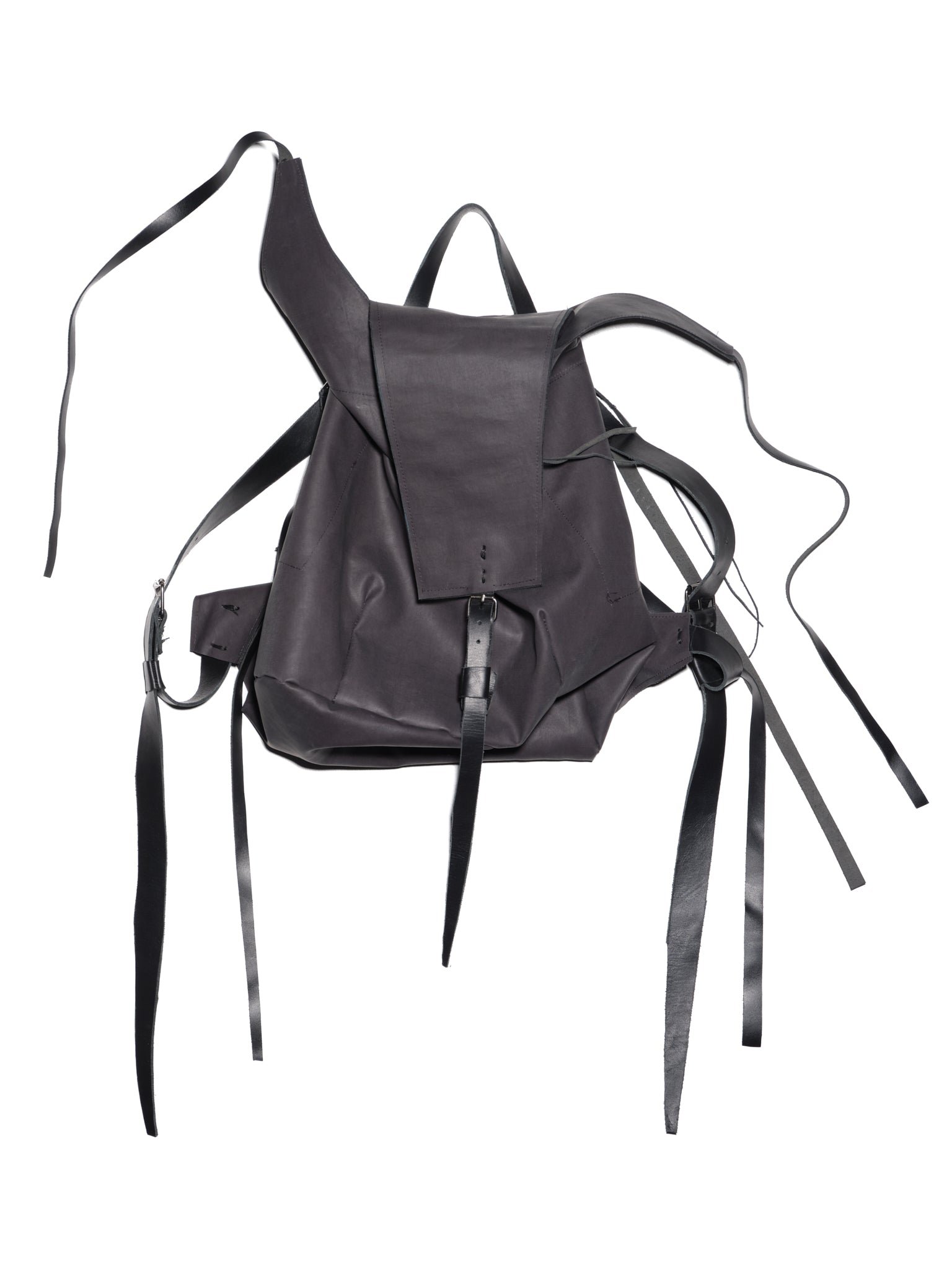 Several additional long, thin, and supple black leather straps extend from the sides, the flap, and the shoulder straps. These loose, floating straps reinforce the impression of movement and organized disorder, while echoing references to technical garments or harnesses.