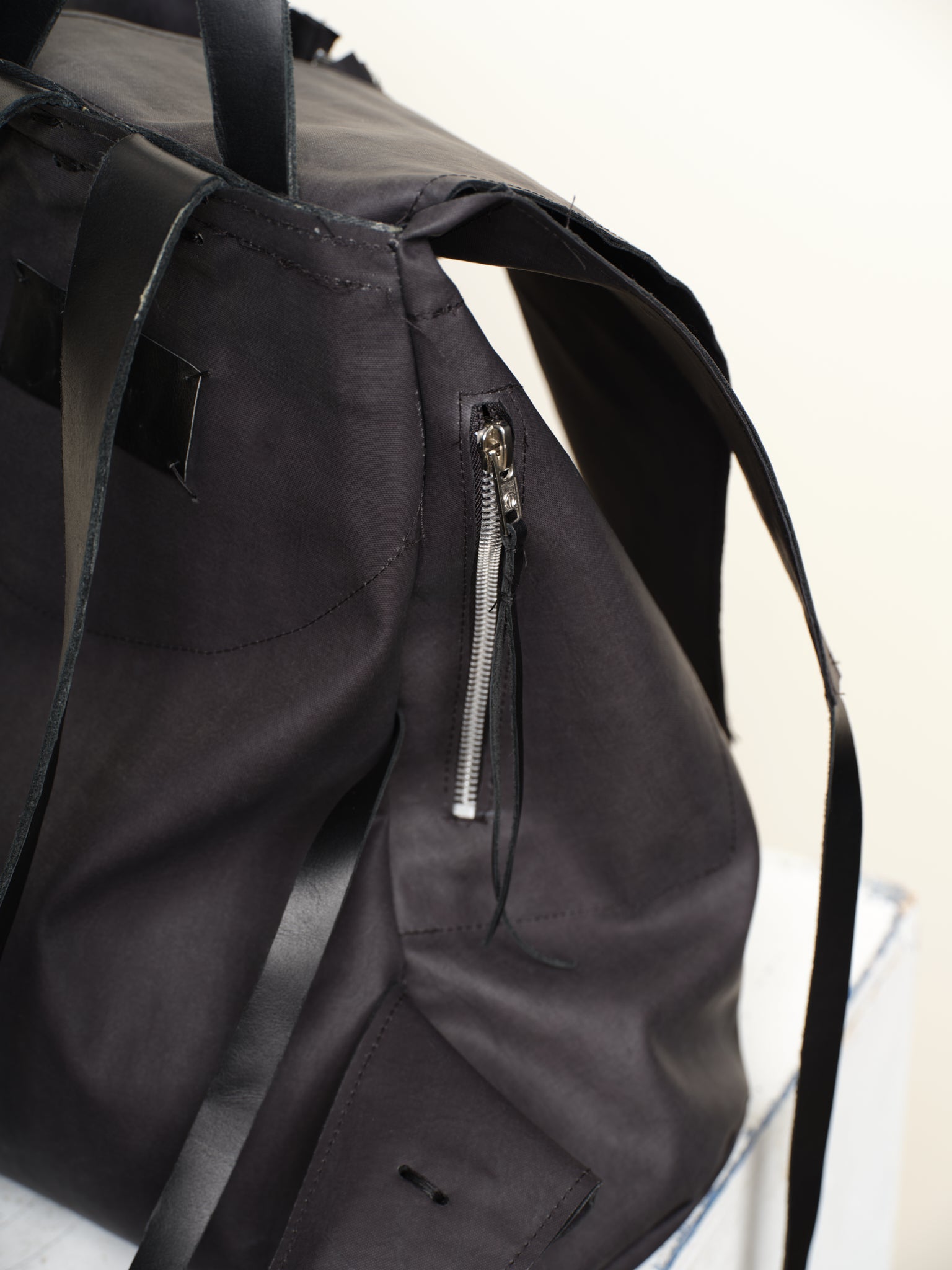This is a backpack made from polyurethane-coated canvas, giving it a rigid appearance. The bag features an asymmetrical and deconstructed shape, deliberately breaking away from the classic backpack aesthetic. The wide, angular main flap closes with a leather strap and a central buckle.