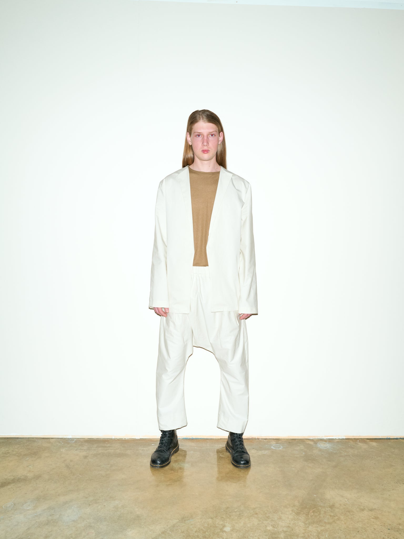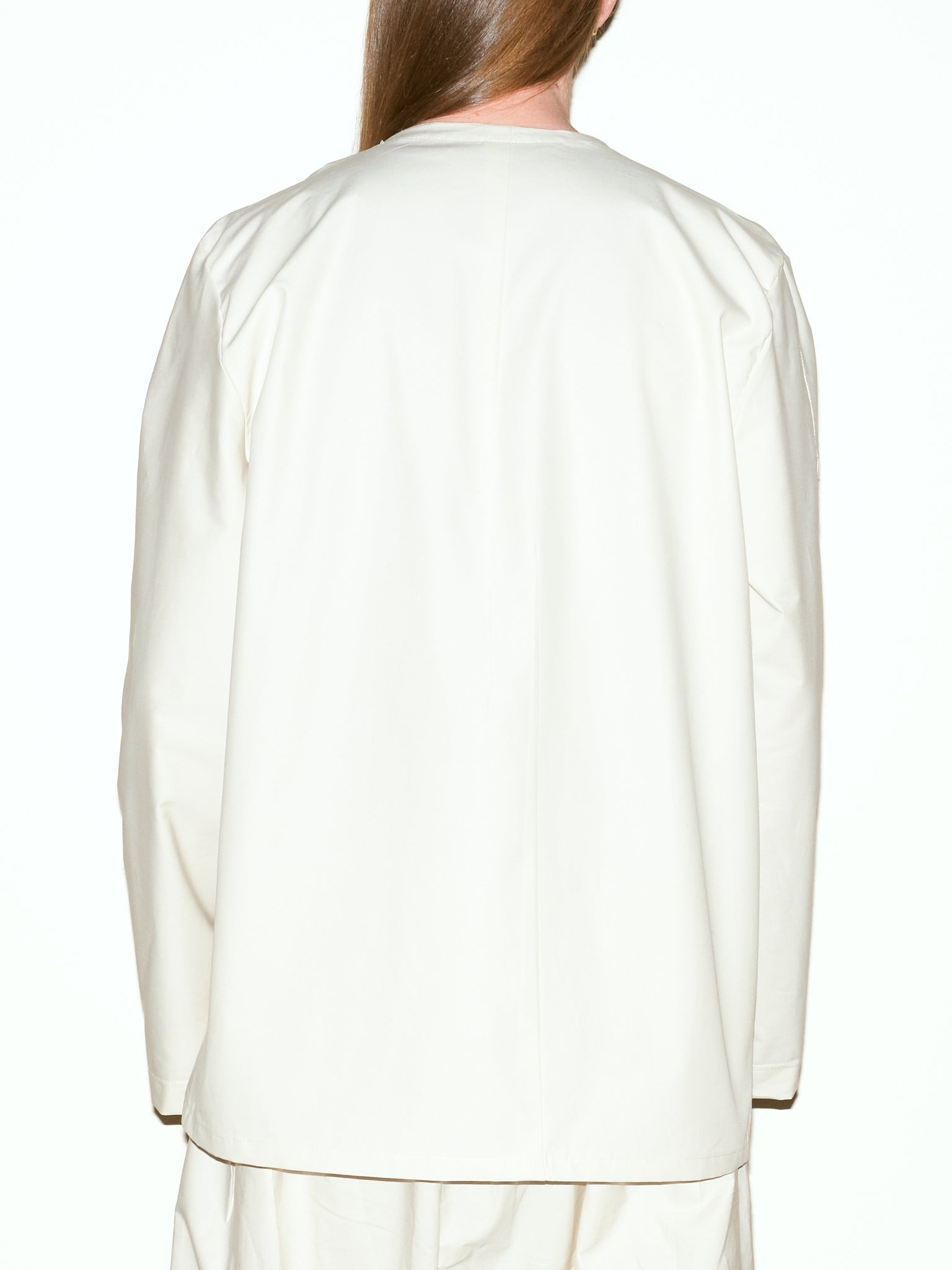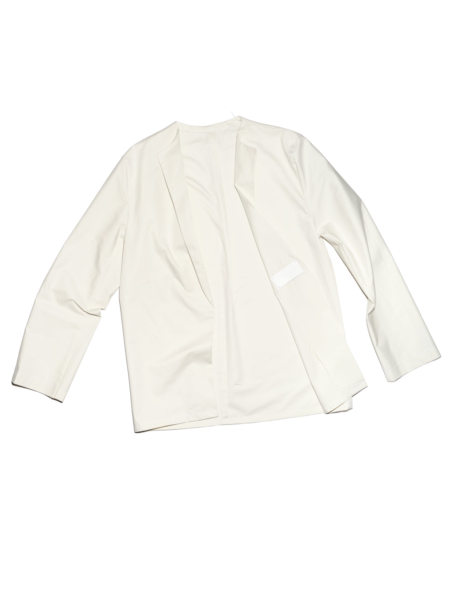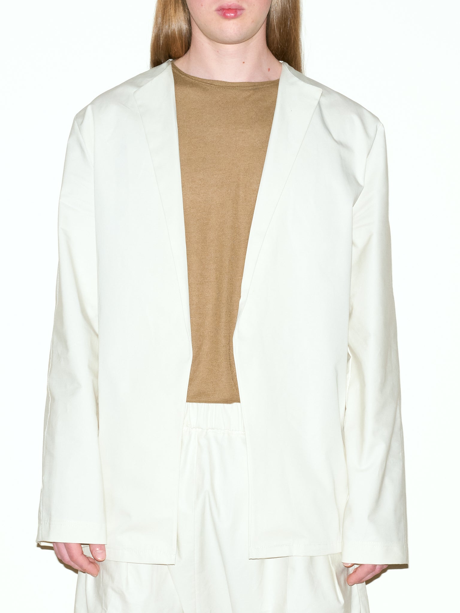 This lightweight jacket (or blazer) is in an ecru or off-white color. It features a fluid, deconstructed cut, characterized by the absence of a collar and visible front closure, giving it a draped, open appearance.