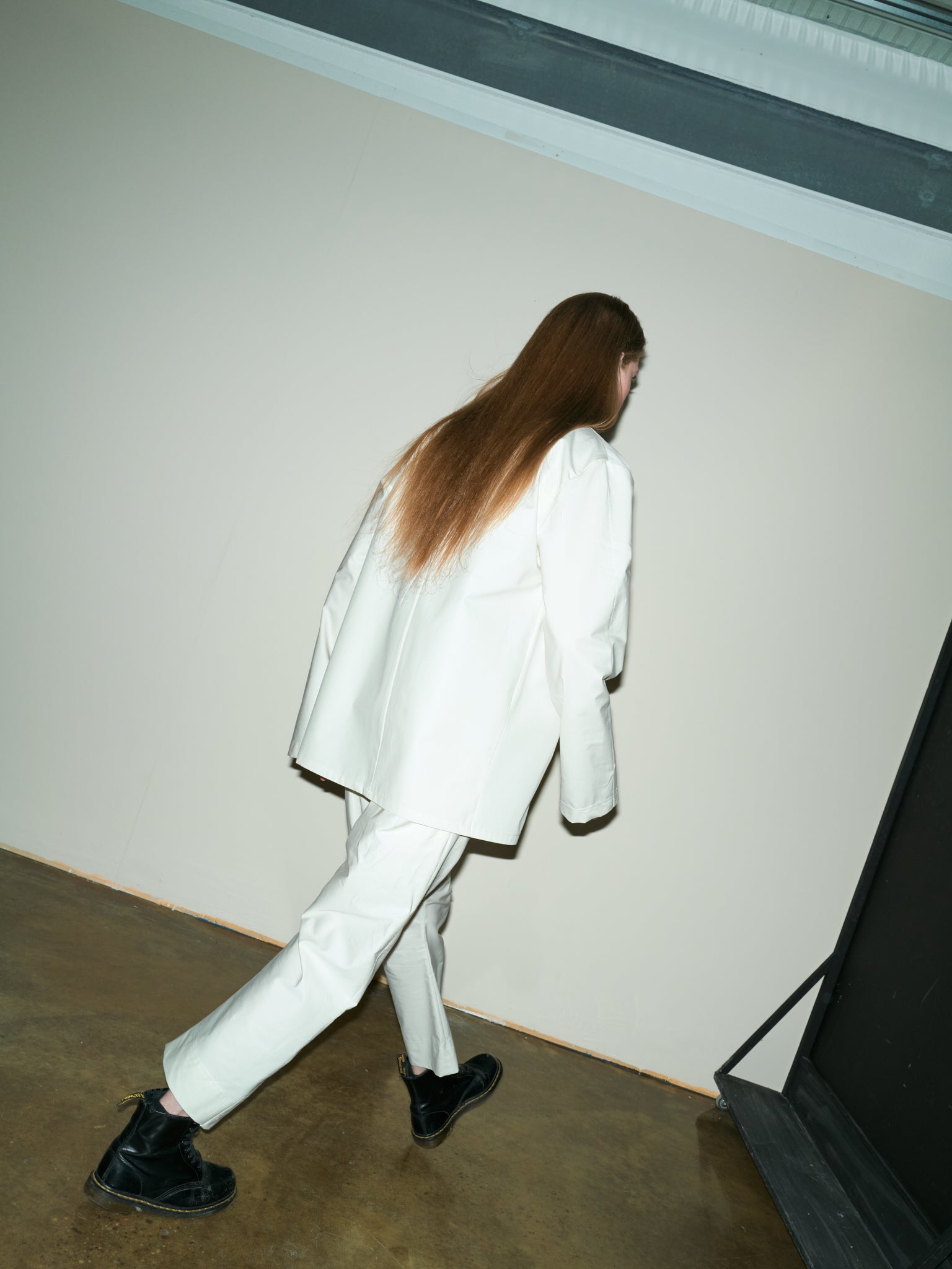 The lapels are wide and fall naturally inward, creating a soft and relaxed effect. The sleeves are long and straight, with a rather ample cut.
