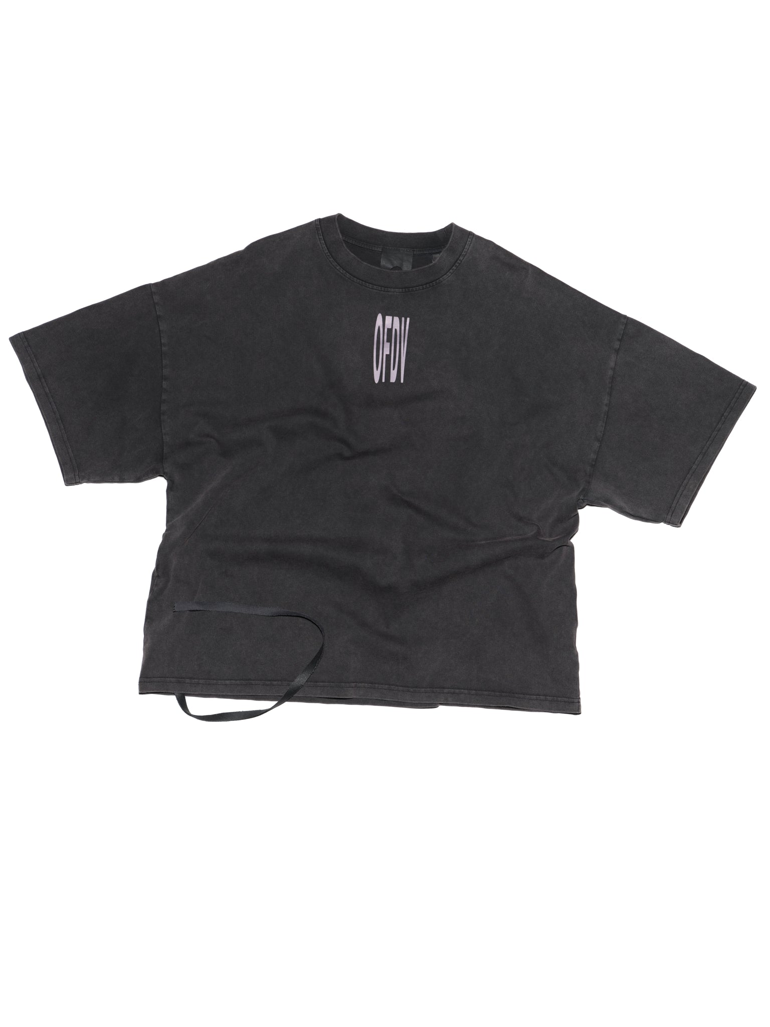 A long, thin black strap hangs from the left side of the hem, adding an asymmetrical and avant-garde detail. The cotton fabric offers a matte and comfortable feel.