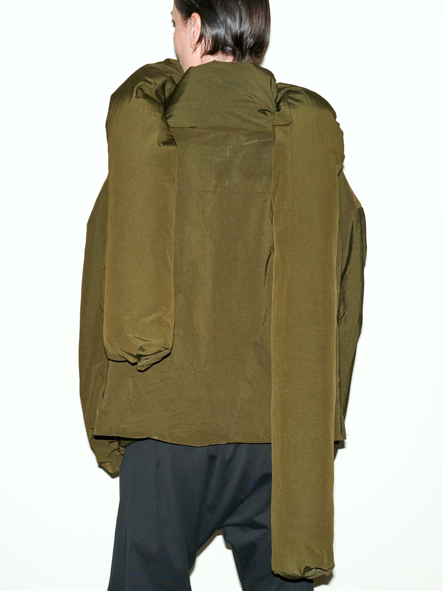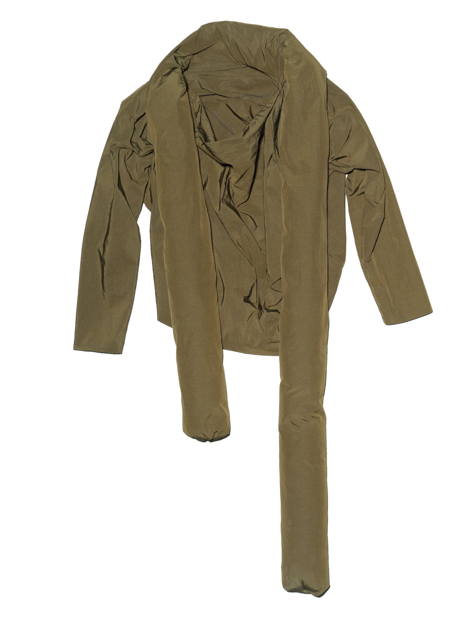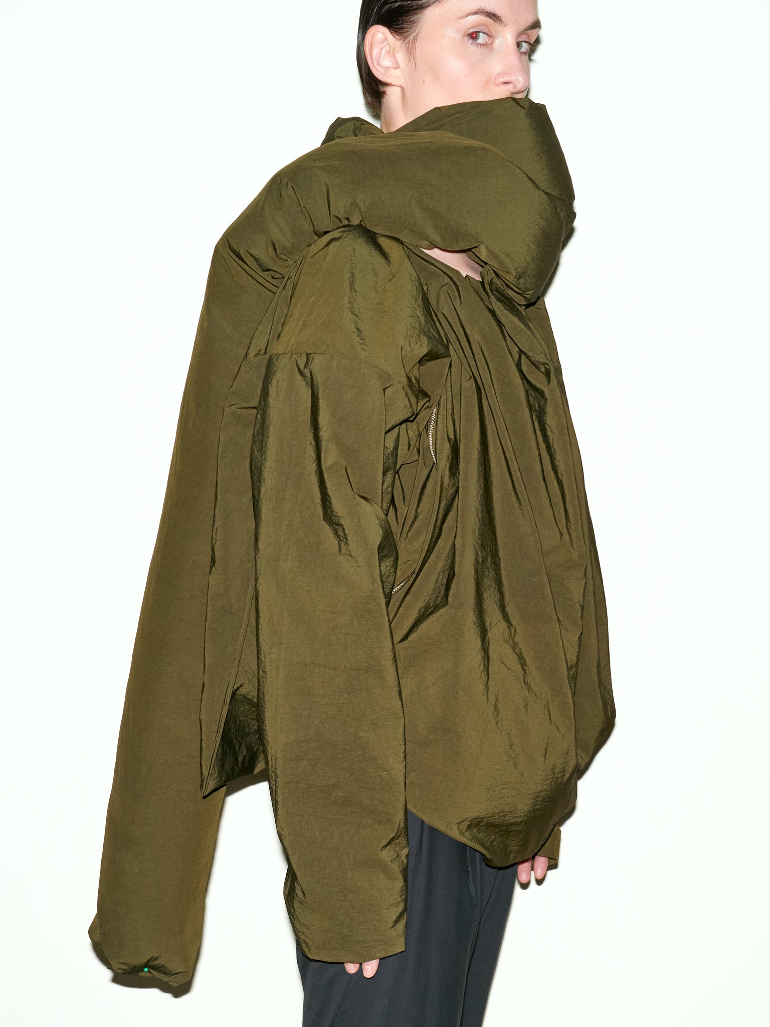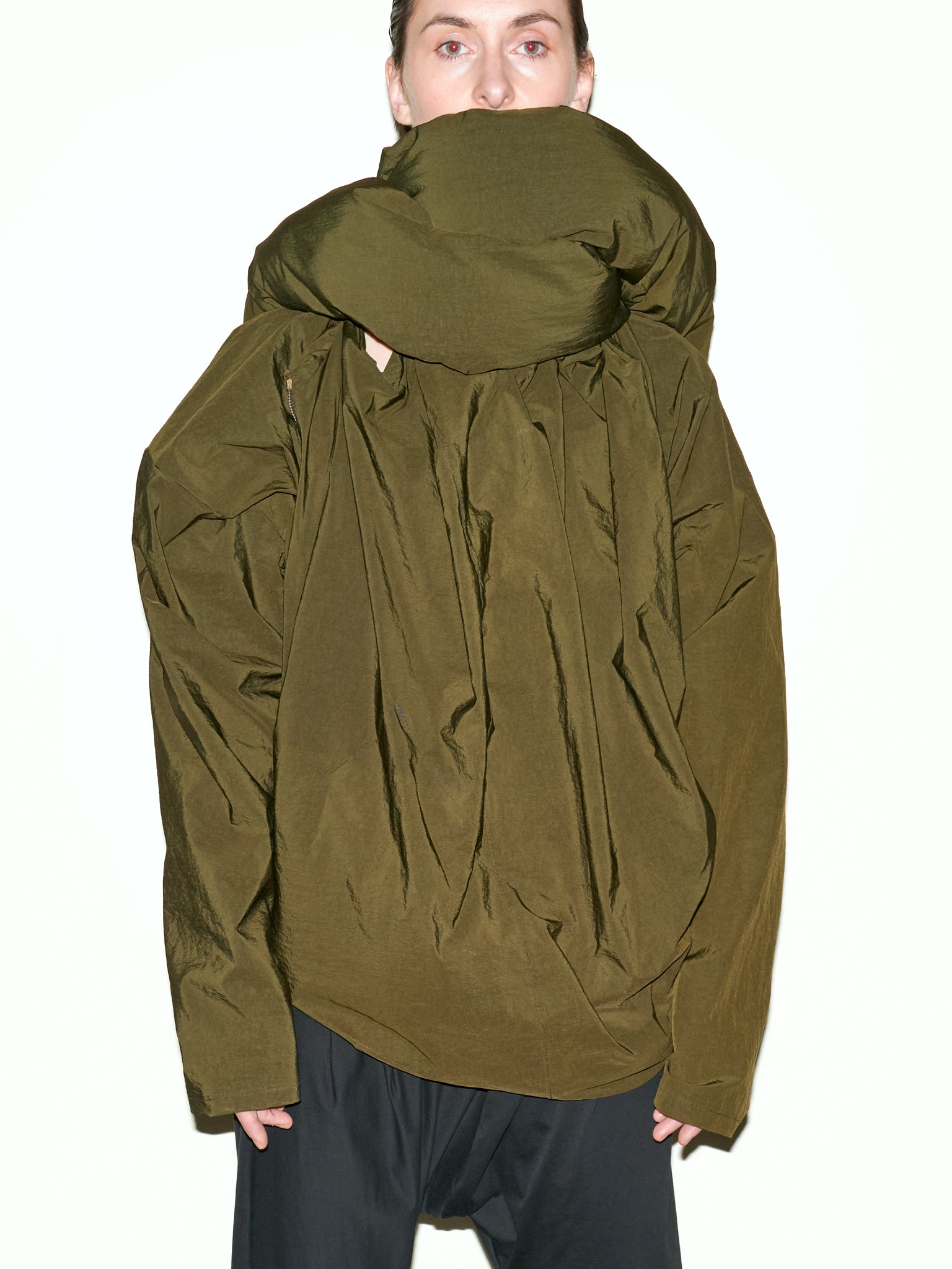 Featuring an oversized cut for a comfortable and enveloping fit, this nylon canvas jacket is a stylish statement piece. Its generous collar extends into a long, padded tubular scarf, adding both comfort and a unique touch. An asymmetrical zipper on the left side completes its modern and avant-garde silhouette.